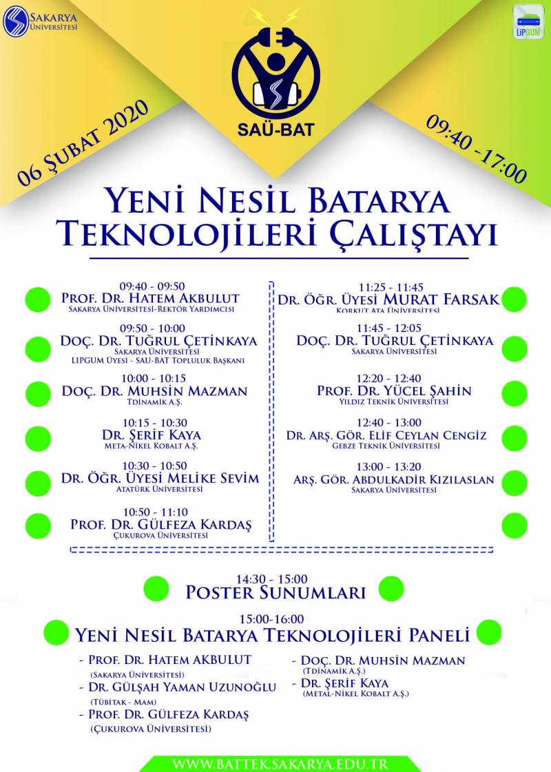 YENİ NESİL BATARYA TEKNOLOJİLERİ ÇALIŞTAYI 06.02.2020 tarihinde Sakarya Üniversitesi kongre merkezinde yapılacaktır. Ayrıntılı bilgi ve ücretsiz kayıt için lütfen tıklayınız.